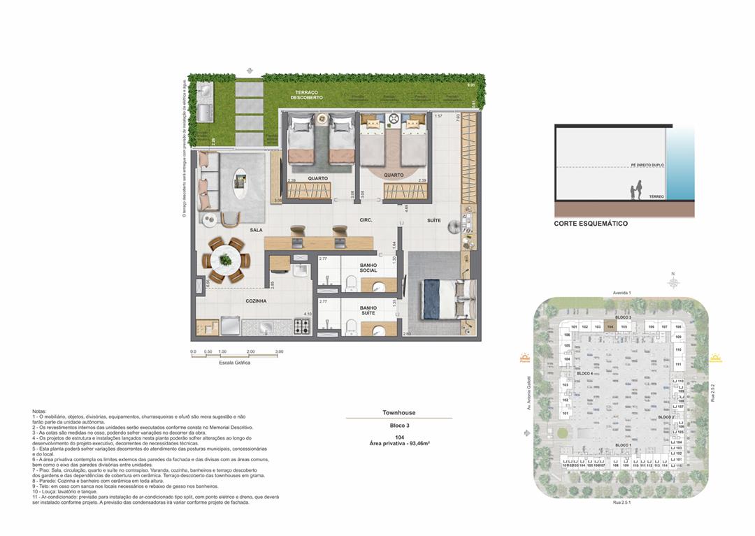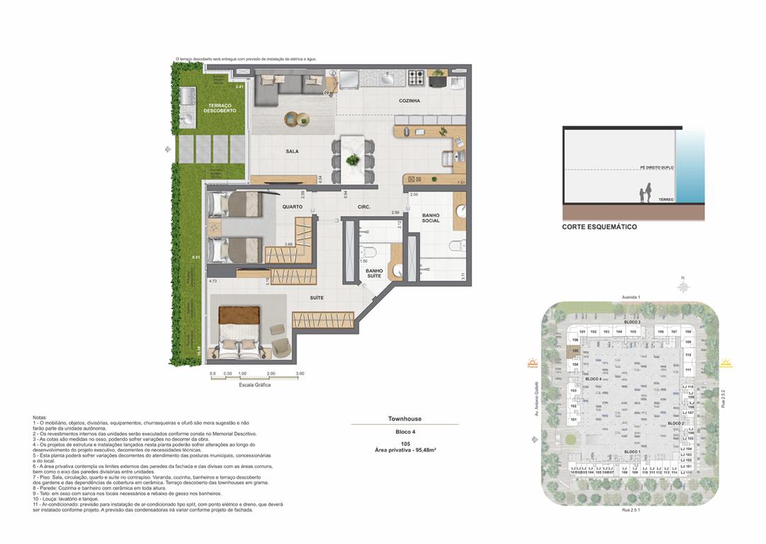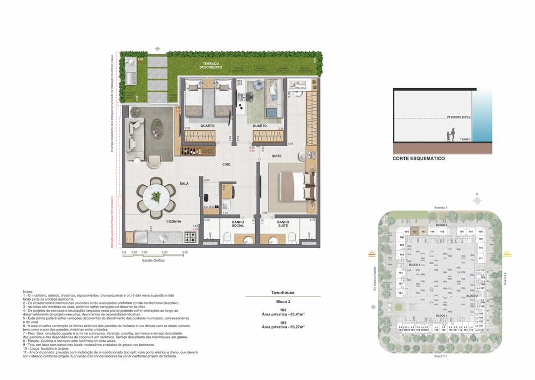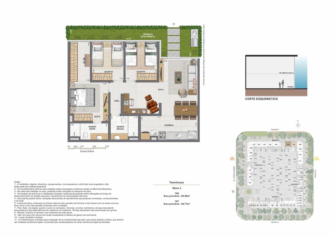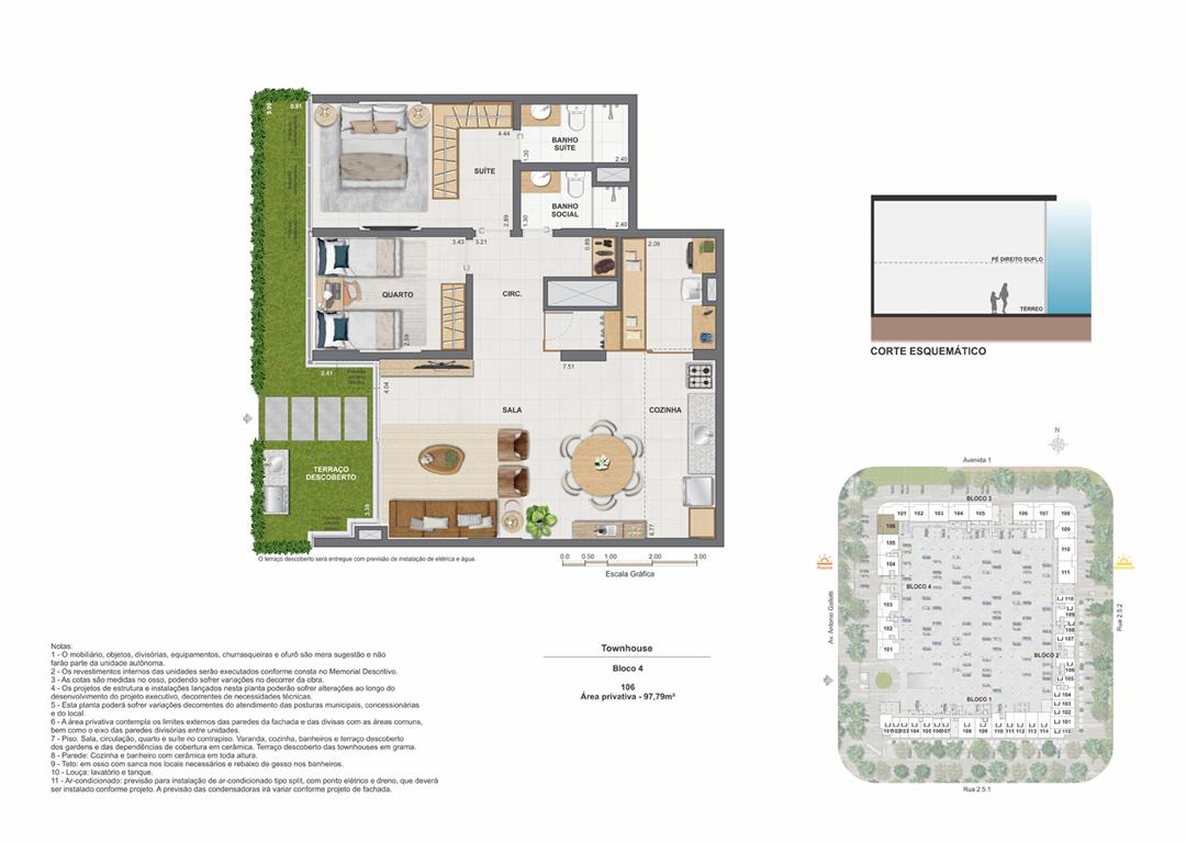 Townhouses: 2 e 3 quartos, com pé-direito duplo, terraço privativo e 1 vaga.