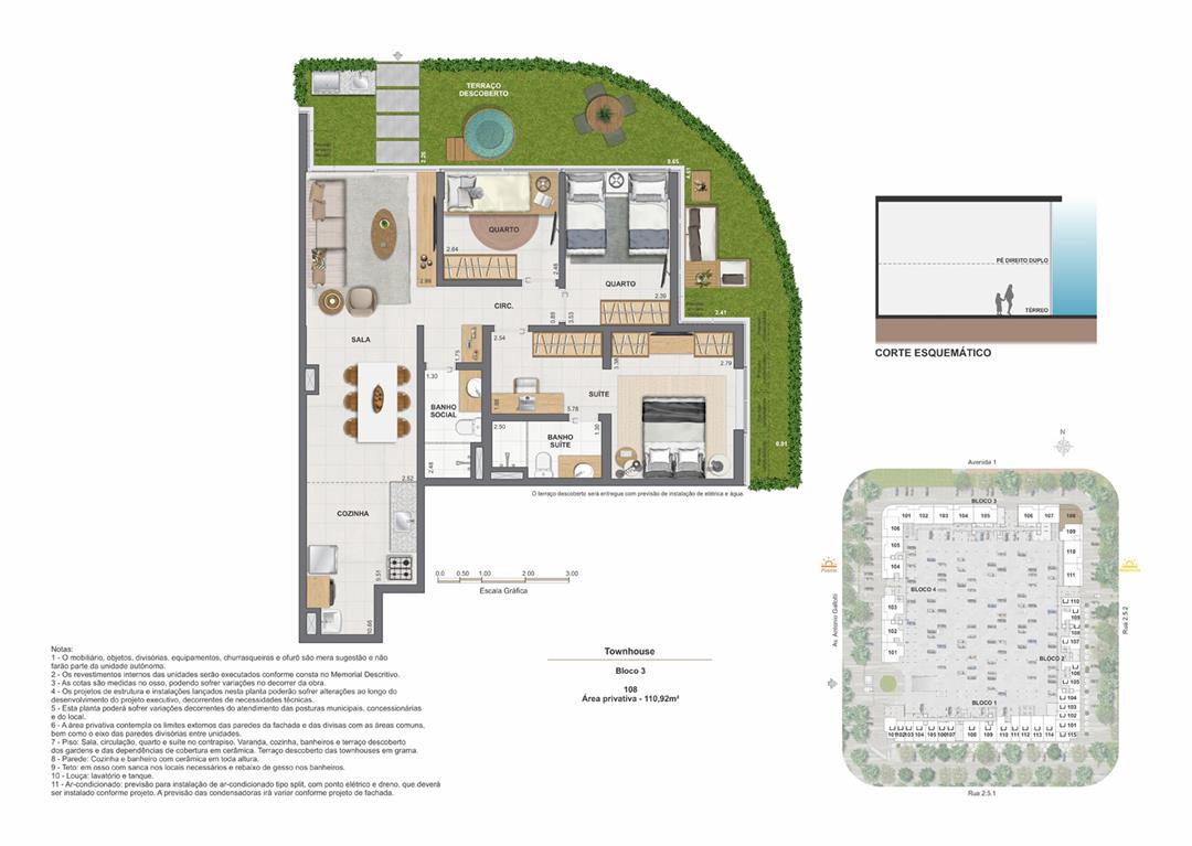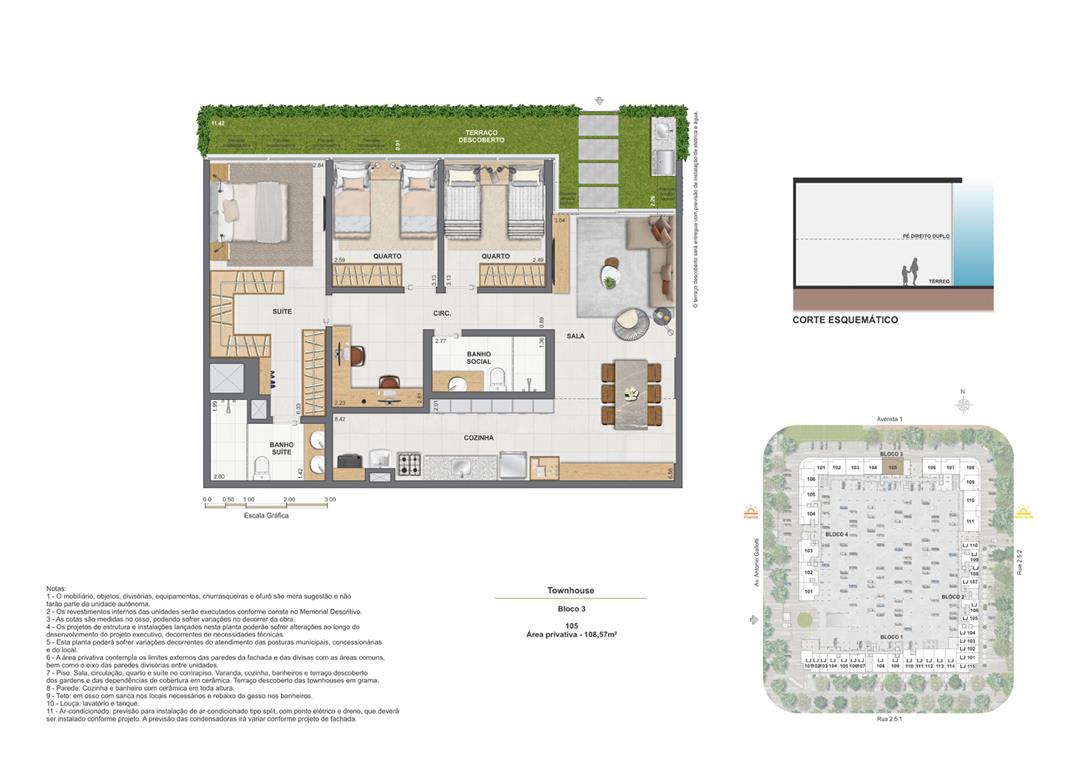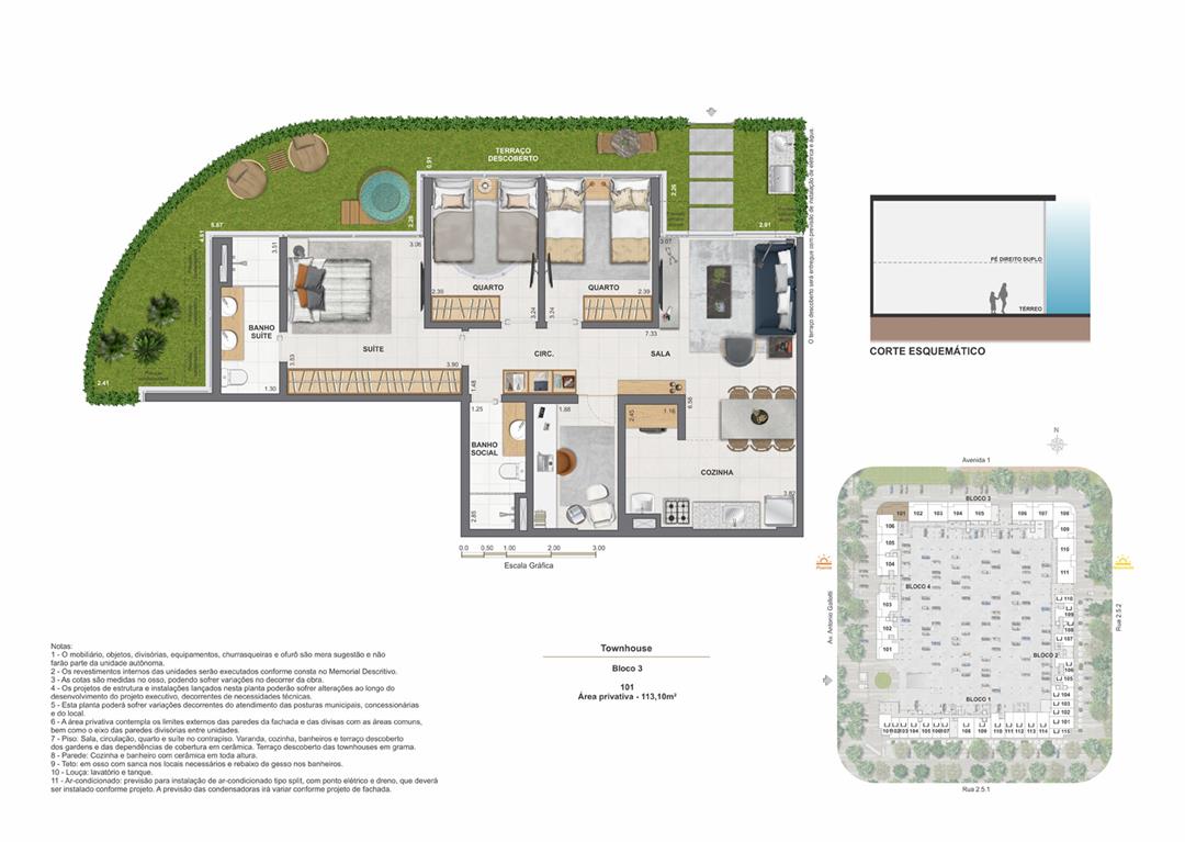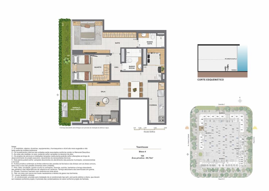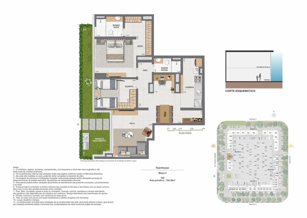 Townhouses: 2 e 3 quartos, com pé-direito duplo, terraço privativo e 1 vaga.