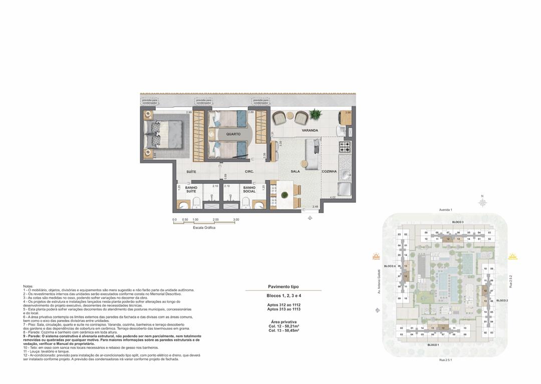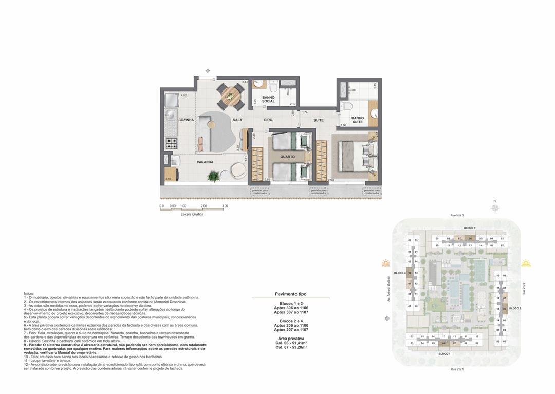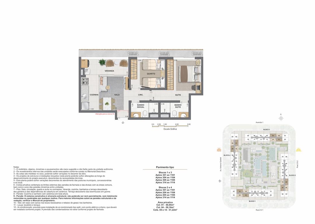 Apartamentos: 2 e 3 quartos com suíte, cozinha integrada à sala e varanda.