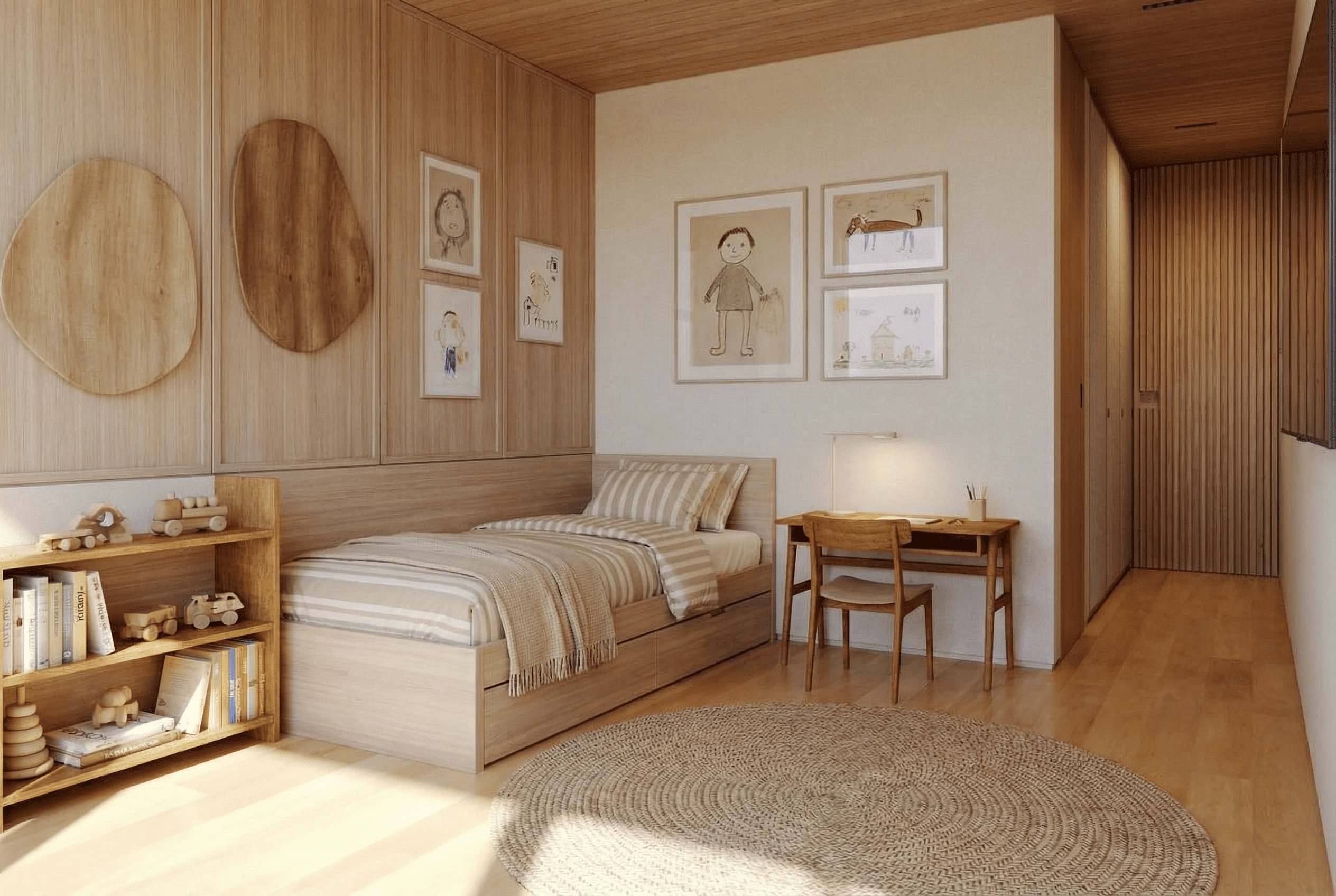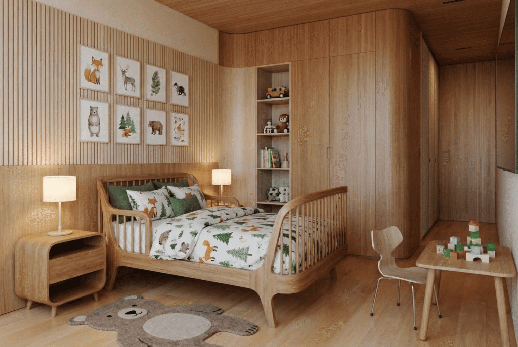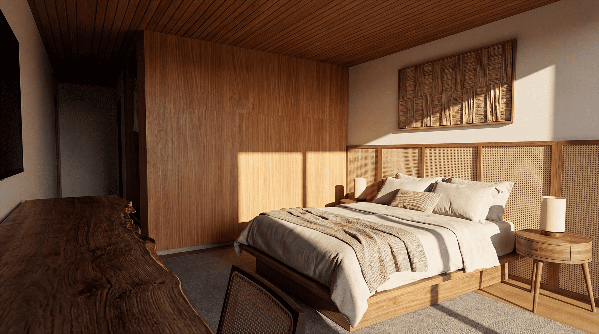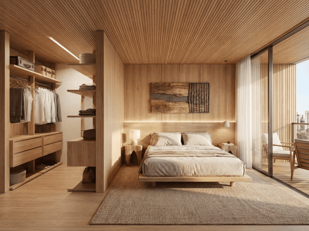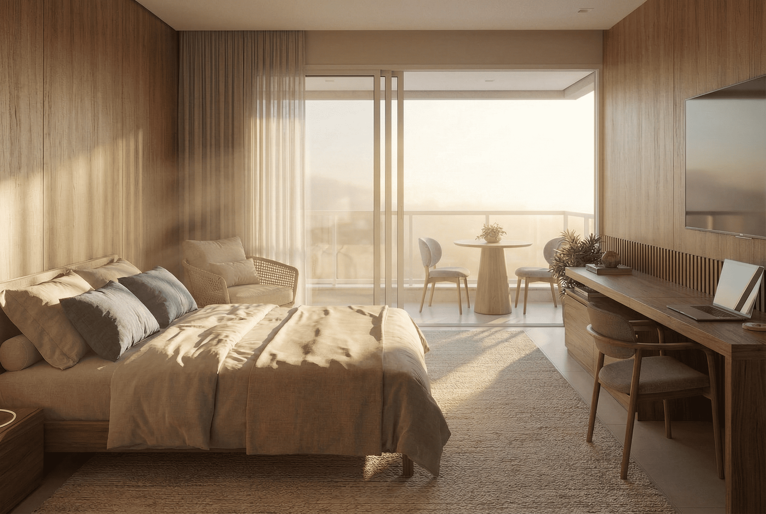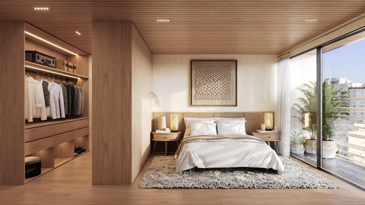 As unidades tipo contam com 4 suítes amplas, todas com ventilação natural e acabamentos de alto padrão. A suíte master é projetada com espaço para closet e banheiro com acabamentos premium.