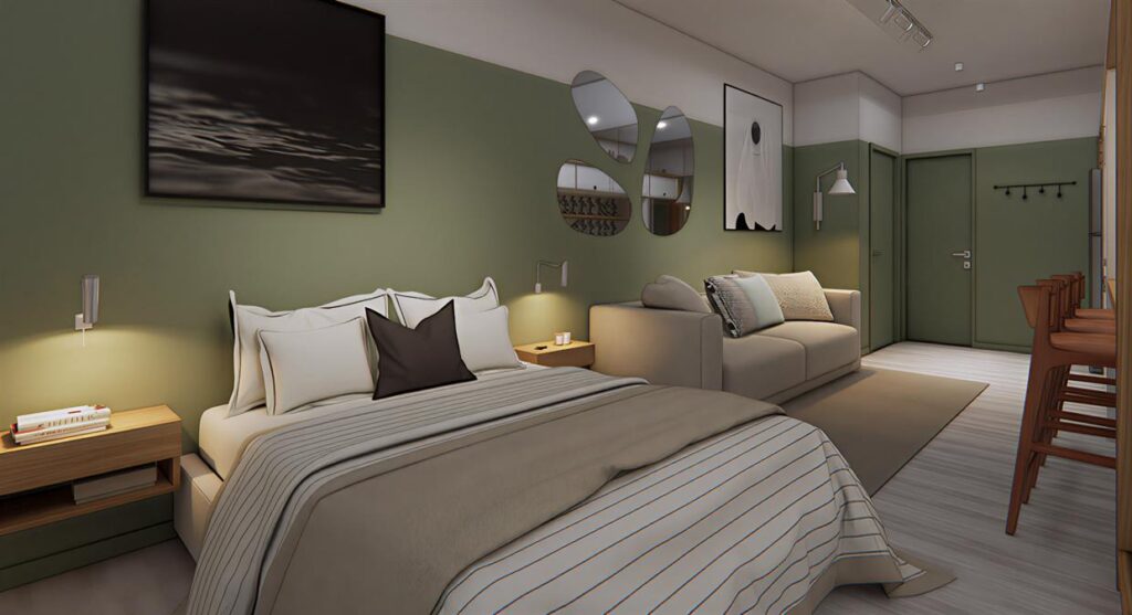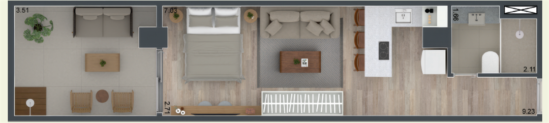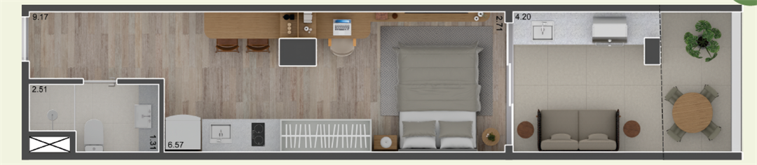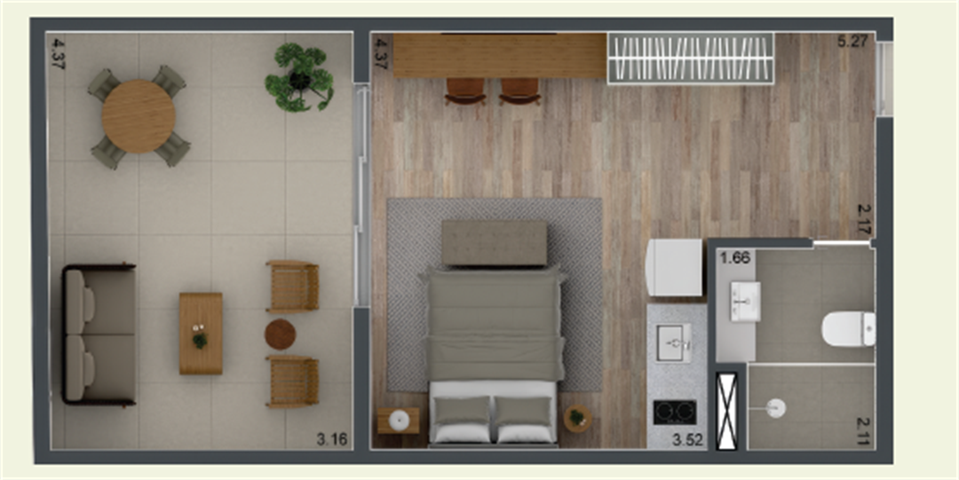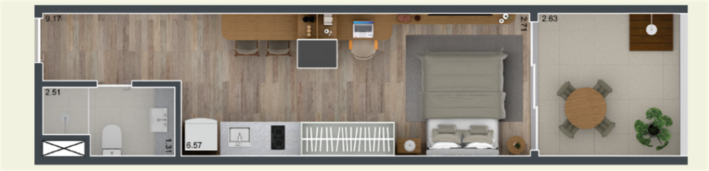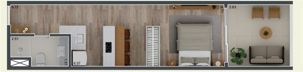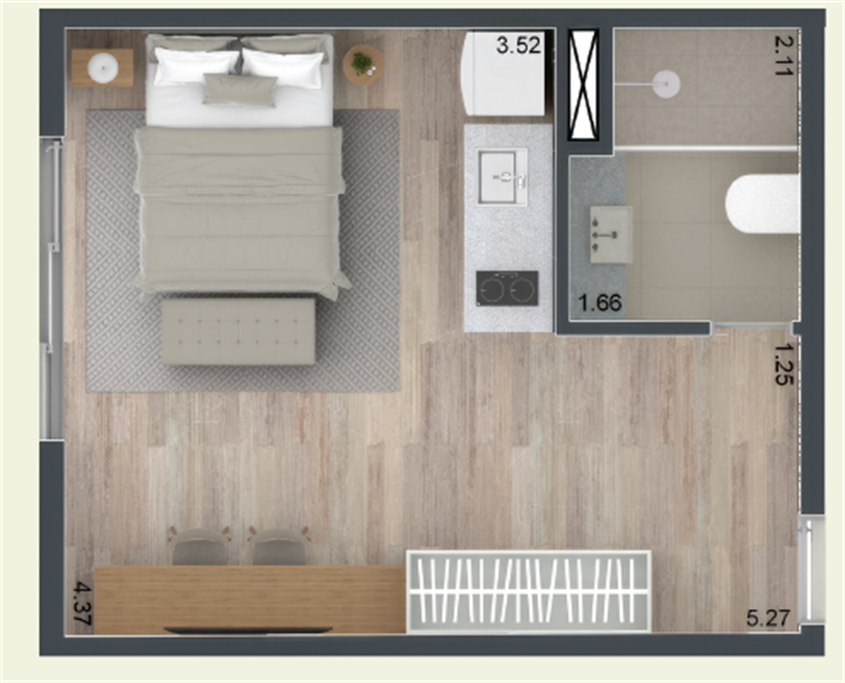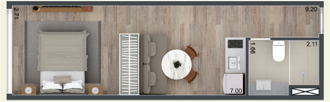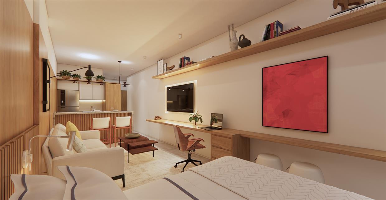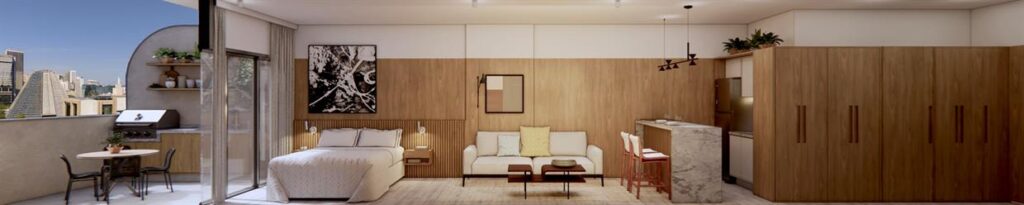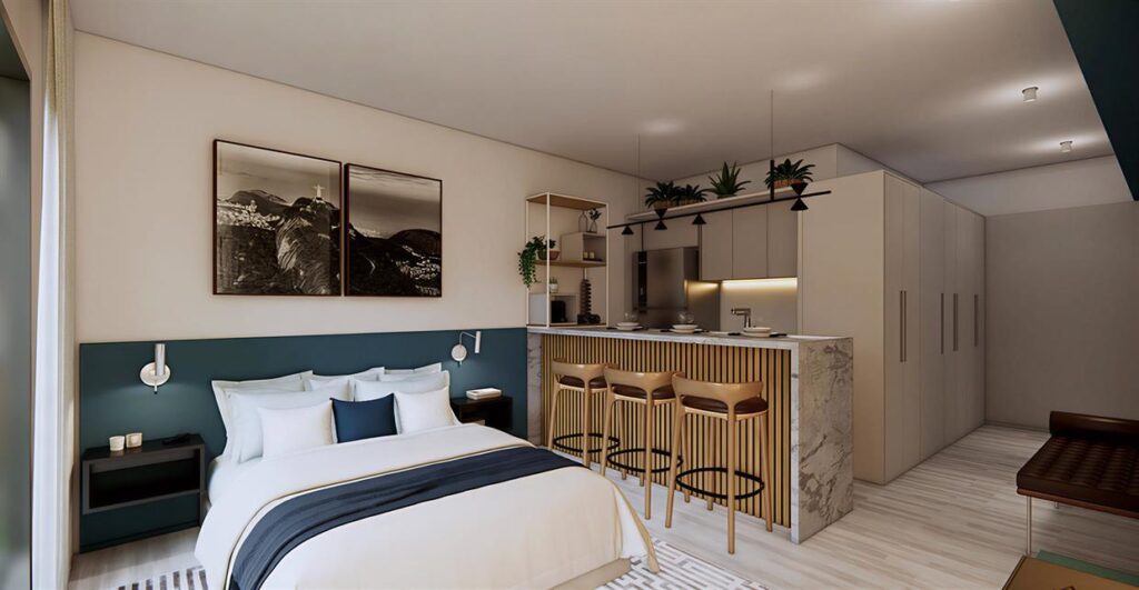 As unidades de studio no Carioca Lapa contam com metragens de 23 m² a 31 m². São ideais para o público single, estudantes ou executivos que buscam otimização de espaço e praticidade no dia a dia, sem abrir mão do design moderno.