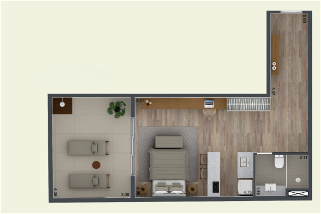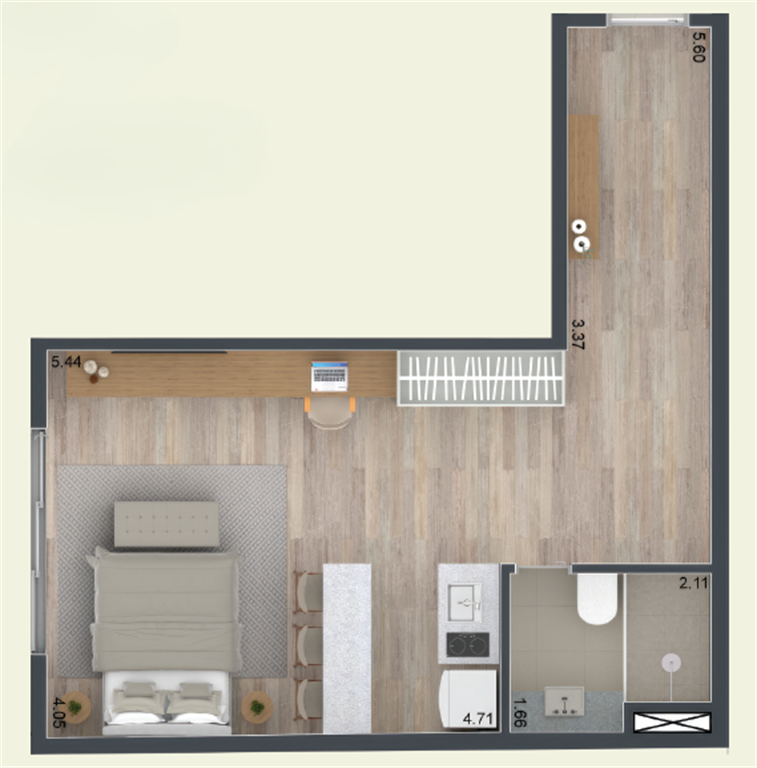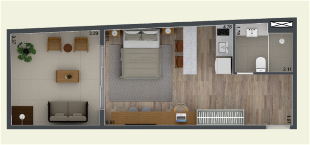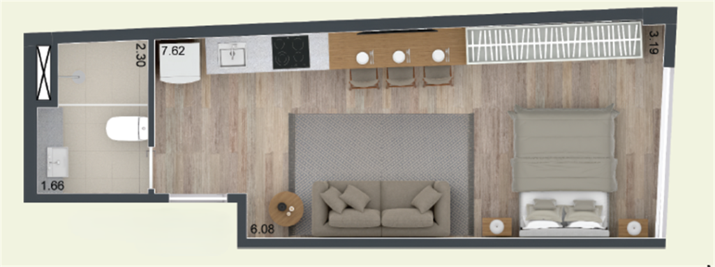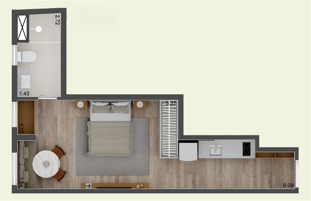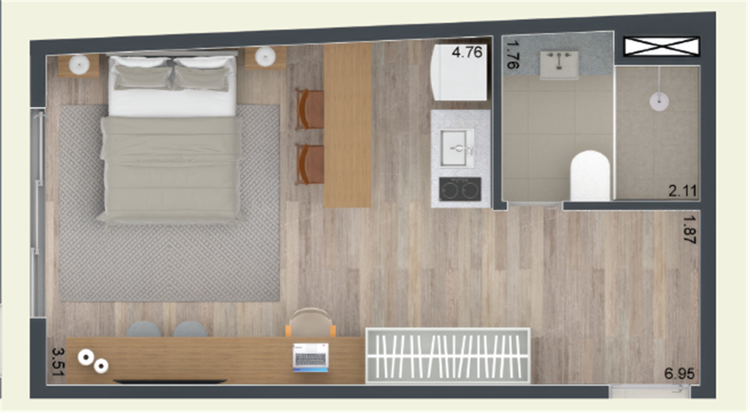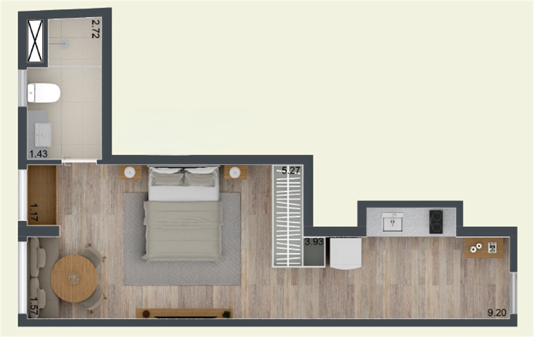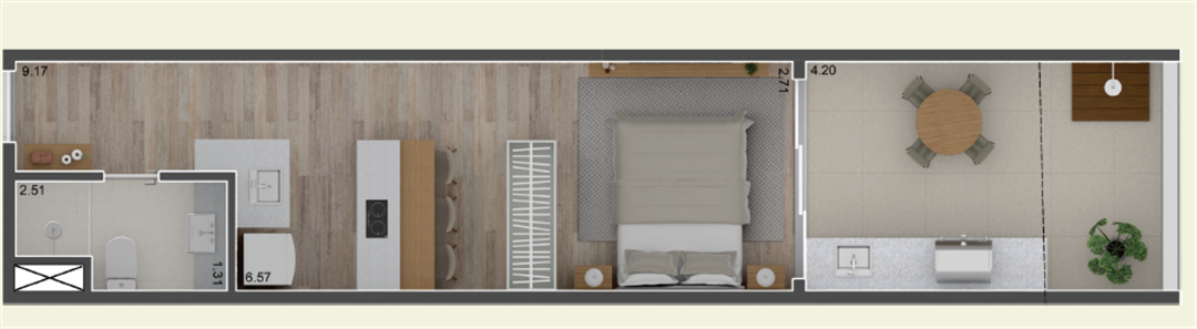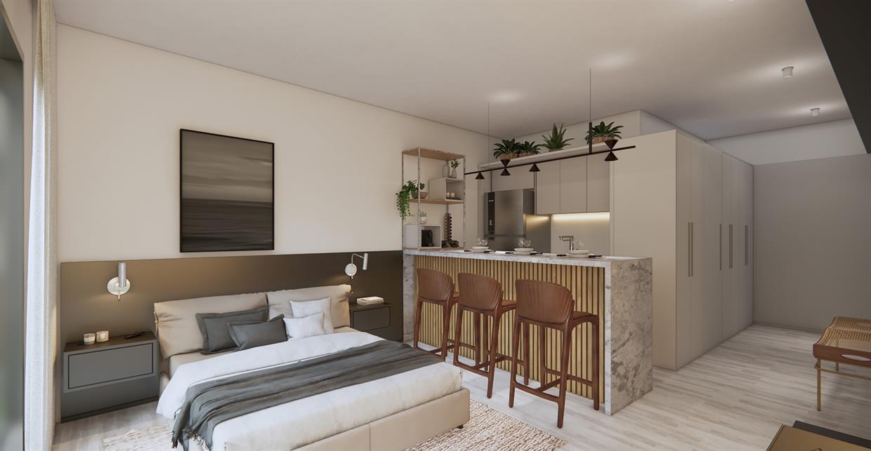 As unidades de studio no Carioca Lapa contam com metragens de 23 m² a 31 m². São ideais para o público single, estudantes ou executivos que buscam otimização de espaço e praticidade no dia a dia, sem abrir mão do design moderno.