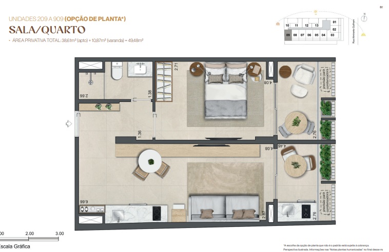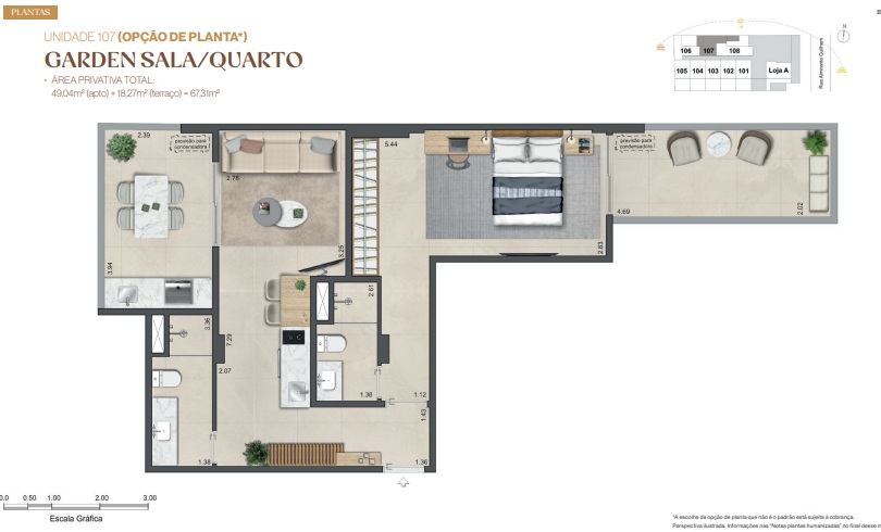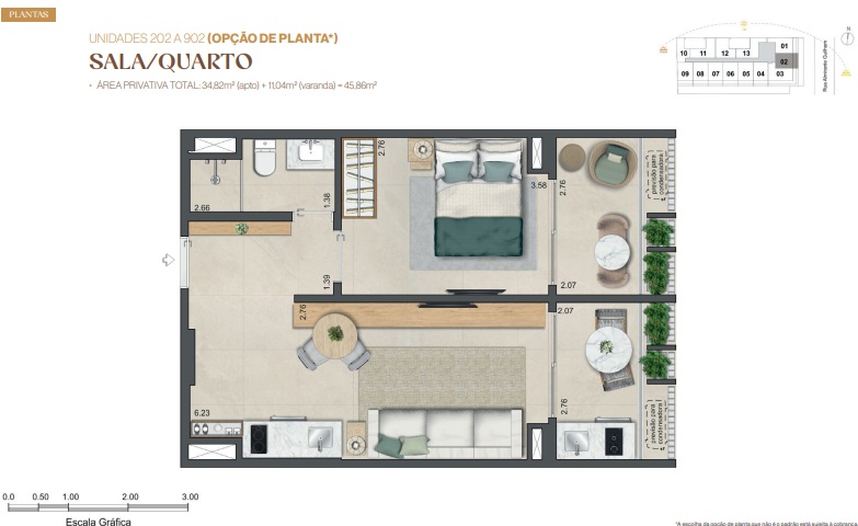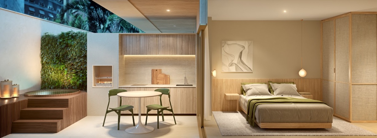 Quarto‑Sala – Layout equilibrado, com conforto e circulação eficiente, ideal para vida solo, casal ou pied‑à‑terre.