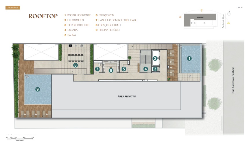O lazer do Guilhem Mozak é um capítulo à parte, cuidadosamente posicionado na cobertura para maximizar vistas e bem-estar: