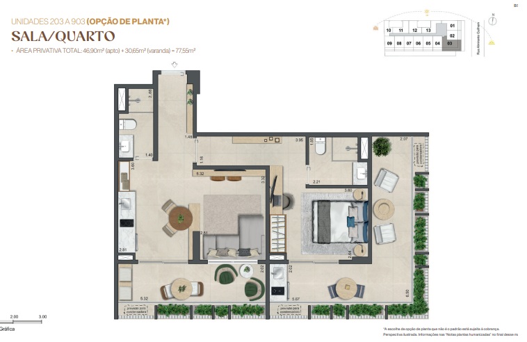 Com 32 m² a 77 m², as plantas do Guilhem Mozak priorizam iluminação natural, ventilação cruzada e a melhor otimização de espaços. O resultado é um morar elegante, ergonômico e funcional — um convite a viver bem.