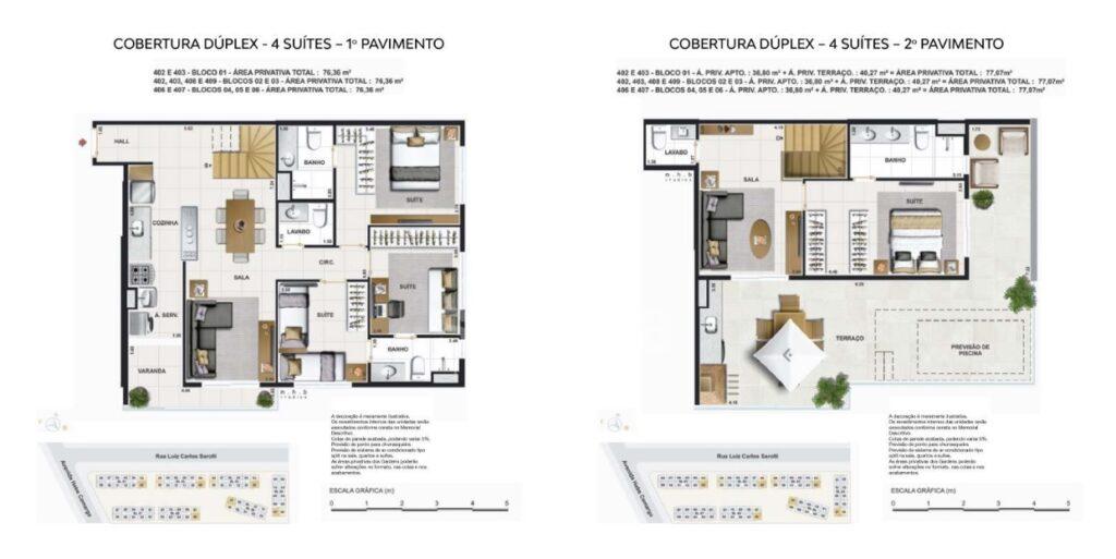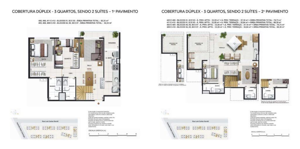 - Vagas de garagem: 01 Vaga apartamento tipo e 02 vagas coberturas