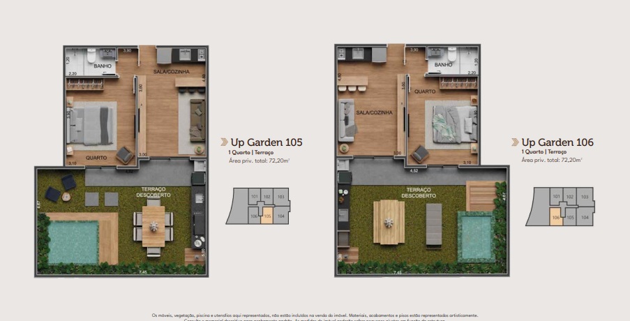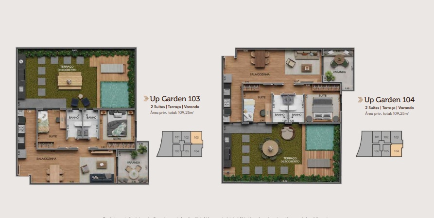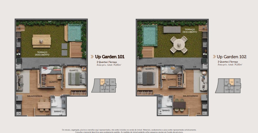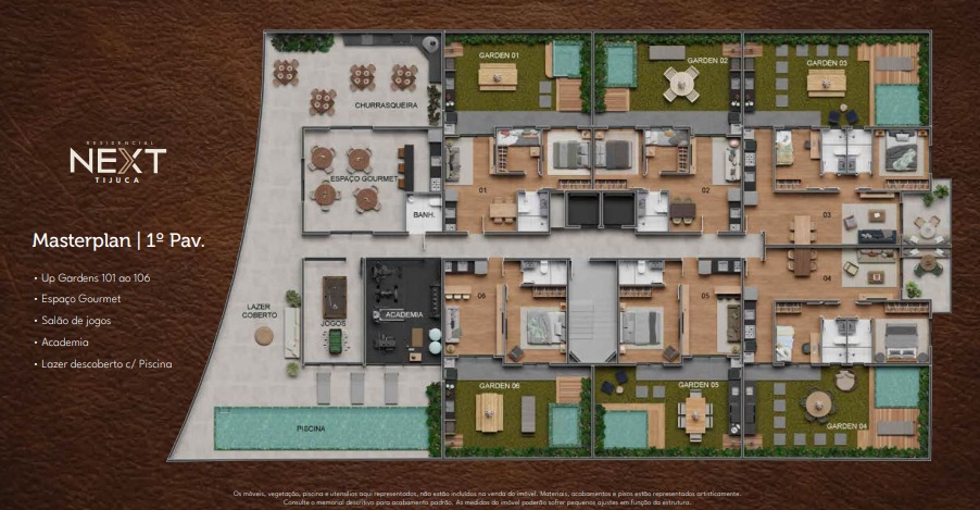 O Residencial Next Tijuca contarpa com unidades Up Garden sendo 1 e 2 quartos/suíte e metragens que vão de 72,20m² a 109,25m². Em outras palavras, você terá um espaço privativo ao ar livre, ideal para cultivar um jardim, montar um espaço zen, ou simplesmente aproveitar as noites de verão com a família em um ambiente totalmente seu.