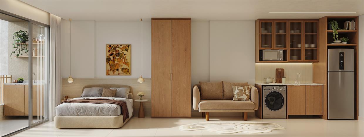 Compactos, funcionais e inteligentes, os studios do Soul Rio Bairro de Fátima oferecem metragens entre 33,69 m² e 34,02 m².