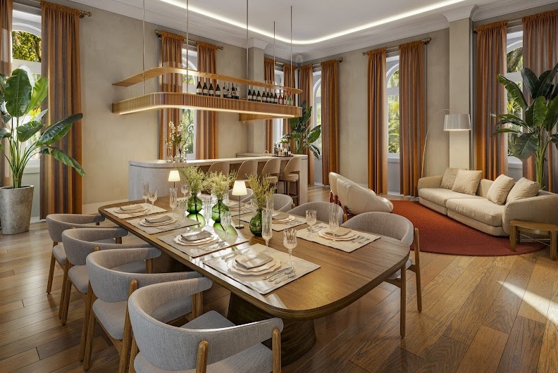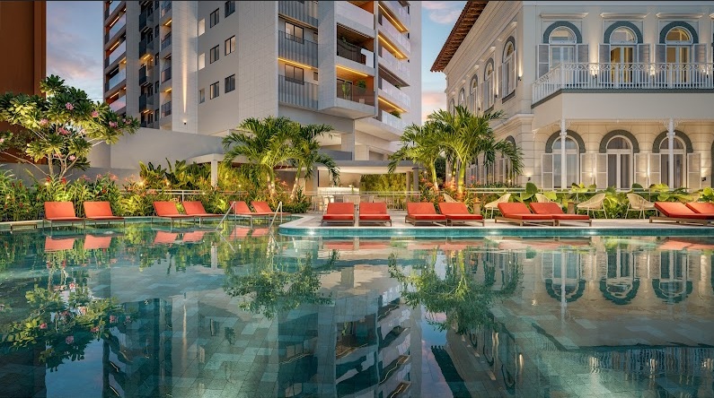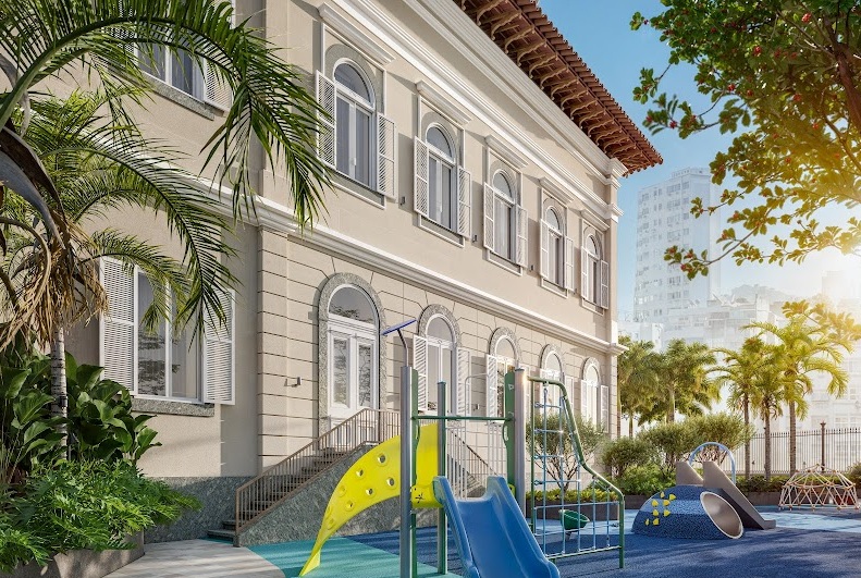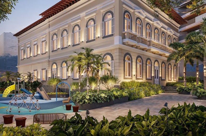 Symphony Flamengo integra de forma magistral um casarão histórico preservado ao projeto moderno. Esta construção não é apenas visual; ela abriga o coração social do empreendimento, unindo a tradição do Rio antigo às facilidades do século XXI.