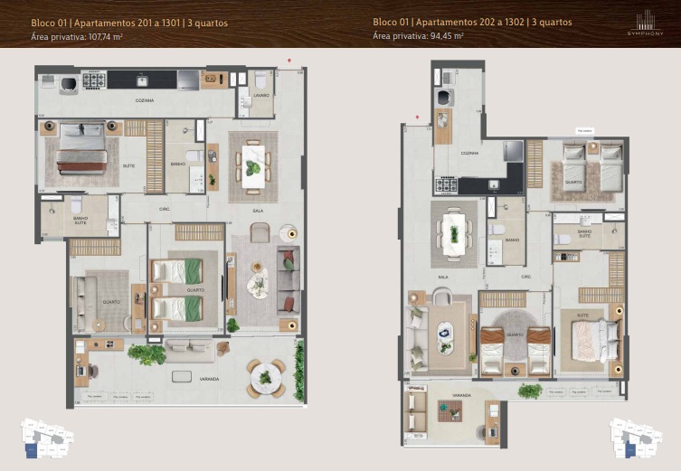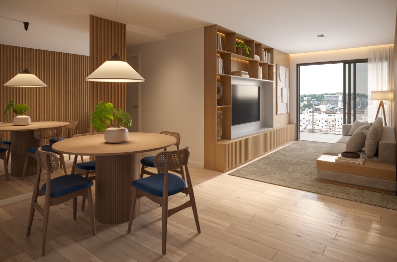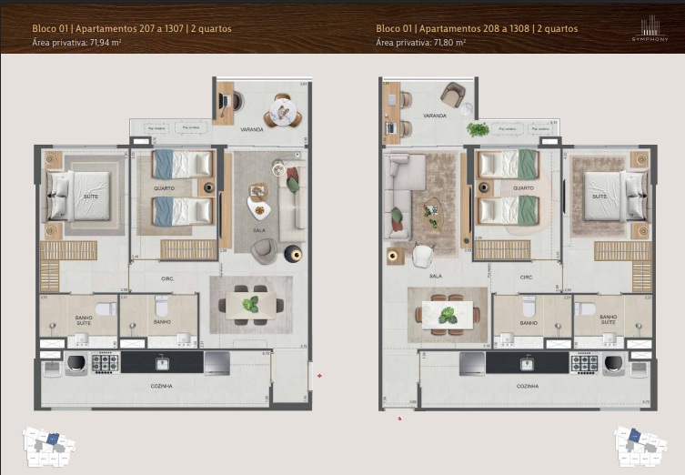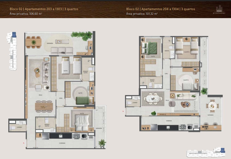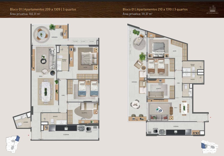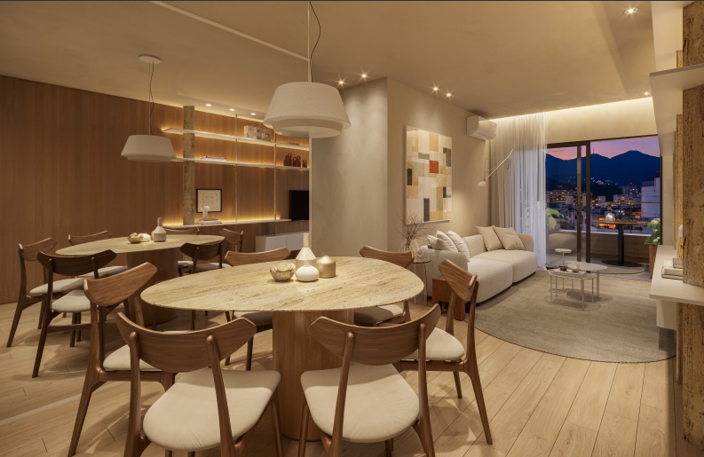 Symphony Flamengo apresenta no seu Bloco 1 unidades de 2 e 3 quartos com metragens que vão de 62,2 m² a 111,37 m². O foco aqui é a amplitude e a integração entre a cozinha e a sala, criando ambientes perfeitos para o convívio familiar.