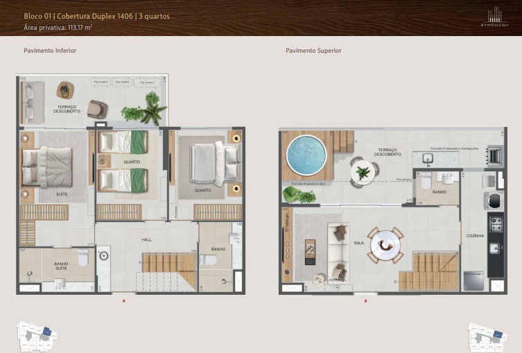 - Coberturas duplex: 113,17 m² a 194,26 m²
