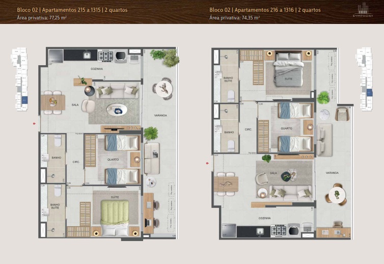 - Apartamentos de 2 quartos: 62,37 a 77,25 m²