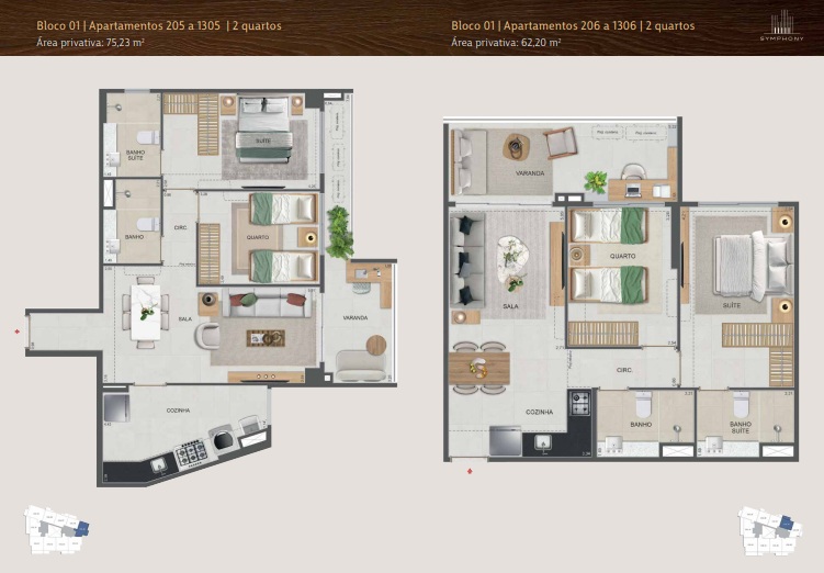 - Apartamentos de 2 quartos: 62,2 a 75,23 m²