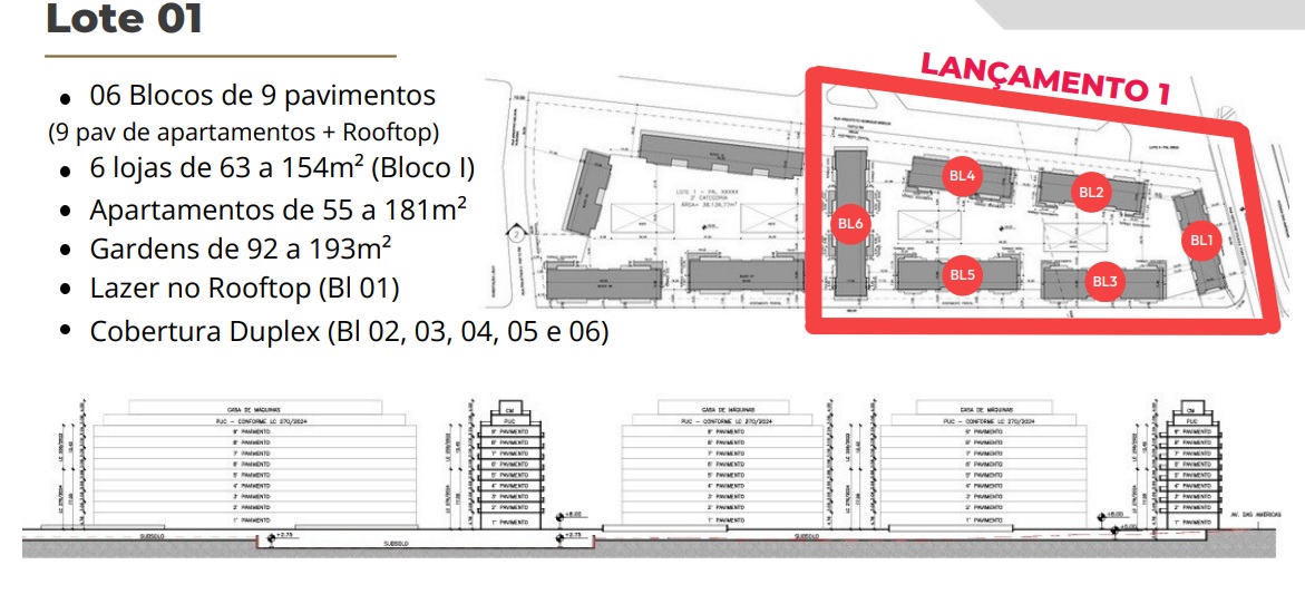 Composto por 27 blocos residenciais e 12 lojas comerciais, o empreendimento será distribuído em três grandes lotes, cada um com características únicas, proporcionando diversidade de opções para diferentes perfis de compradores.